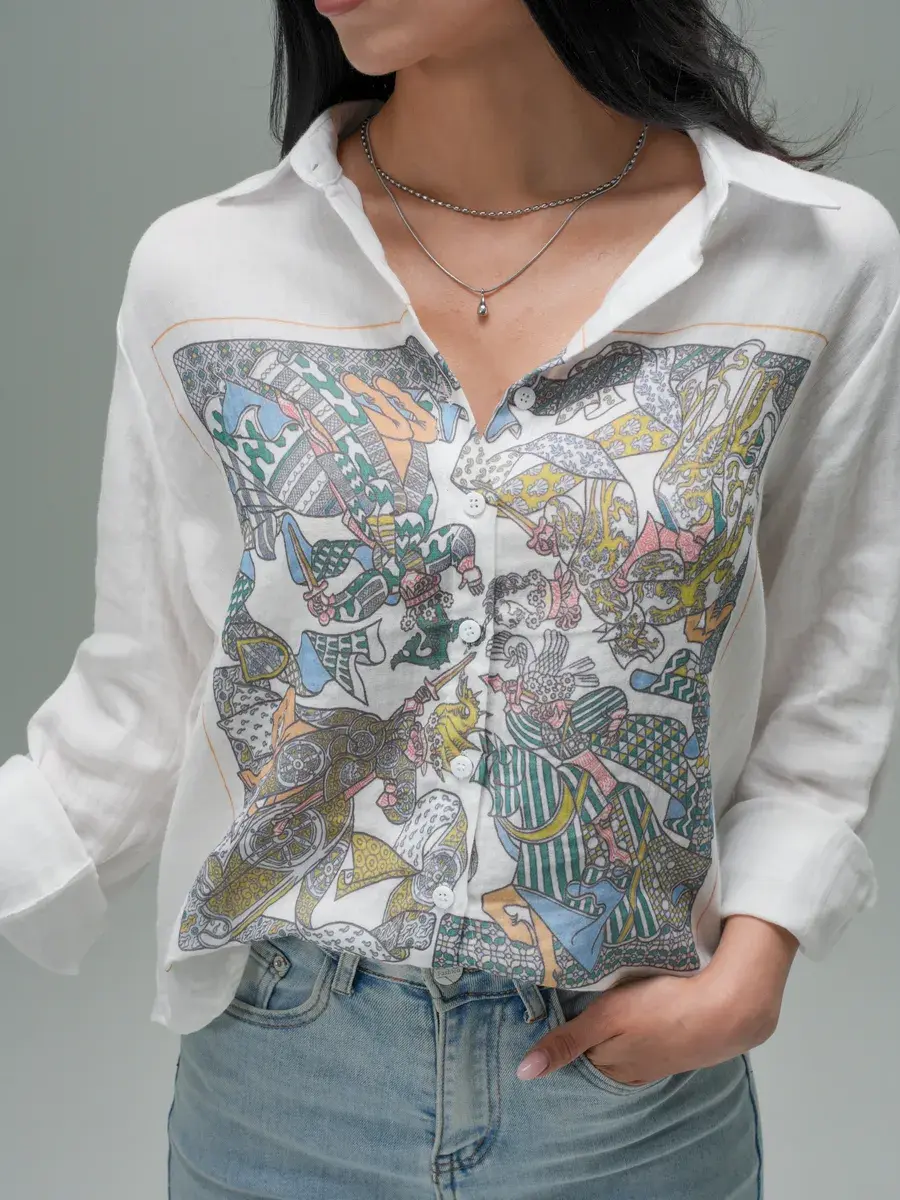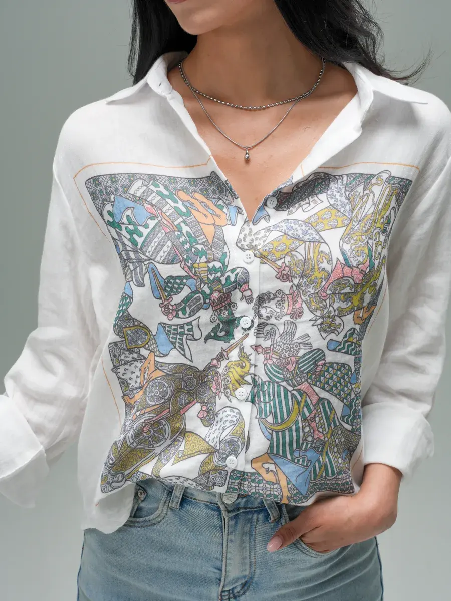 Женская белая офисная блузка с длинным рукавом станет отличным выбором для создания нарядного образа. Изготовленная из качественного хлопка, она обеспечивает комфорт и приятные тактильные ощущения в течение всего дня. Элегантный принт «всадники» добавляет изделию оригинальности и подчеркивает индивидуальность. Такая модель идеально подходит для работы в офисе, деловых встреч или торжественных мероприятий, где важен стиль и аккуратность. Продуманный крой гарантирует удобство и свободу движений, а длинный рукав помогает сохранить опрятный вид в прохладное время года. Универсальный белый цвет легко сочетается с различными элементами гардероба, позволяя создавать как строгие, так и более свободные сочетания. Эта нарядная женская блузка отлично впишется в повседневный и деловой стиль, подчеркнув вашу женственность и вкус.
