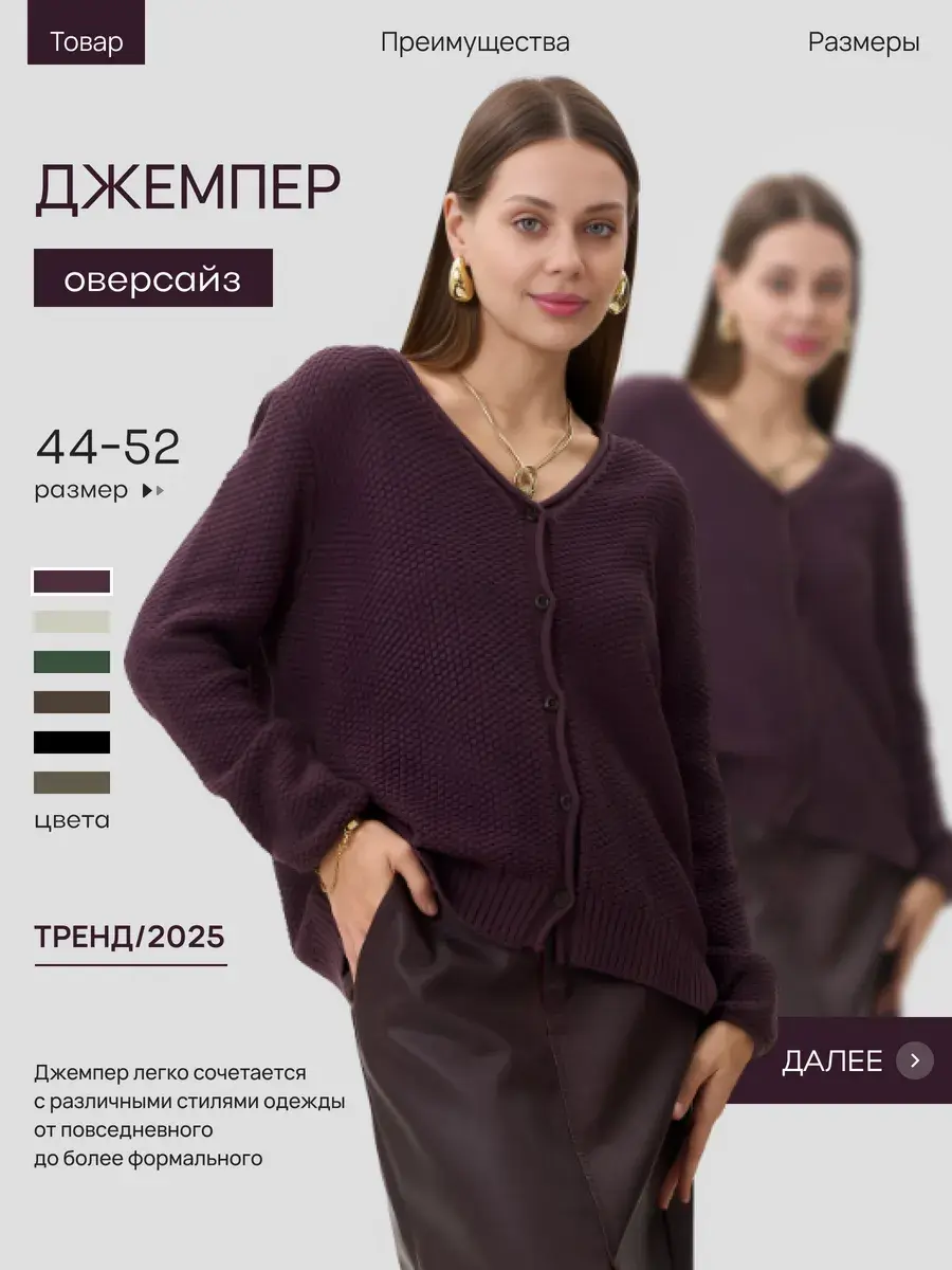 Женский джемпер оверсайз — это модный элемент гардероба, который сочетает в себе стиль и комфорт. Он станет отличным выбором для любого случая: от повседневных встреч до более нарядных выходов. Изготовленный из тонкого, вязаного материала, не только теплый, но и приятный на ощупь. Его свободный фасон позволяет легко сочетать его с различными предметами одежды, такими как брюки или юбки, создавая разнообразные образы. Прекрасно подойдет для создания как уютных, так и более изысканных нарядов, добавляя индивидуальность вашему стилю. Этот джемпер станет прекрасным дополнением вашего гардероба, позволяя вам оставаться в тренде и чувствовать себя комфортно в любую погоду