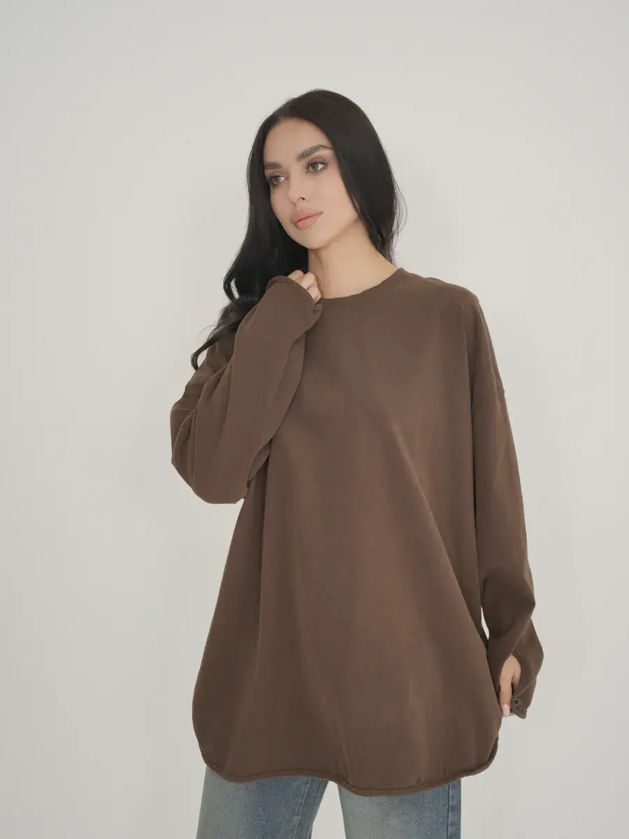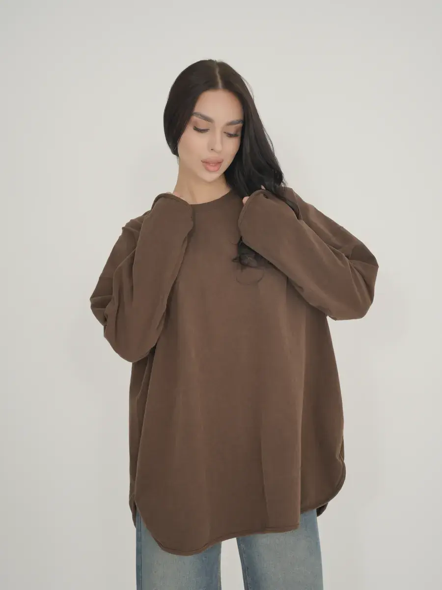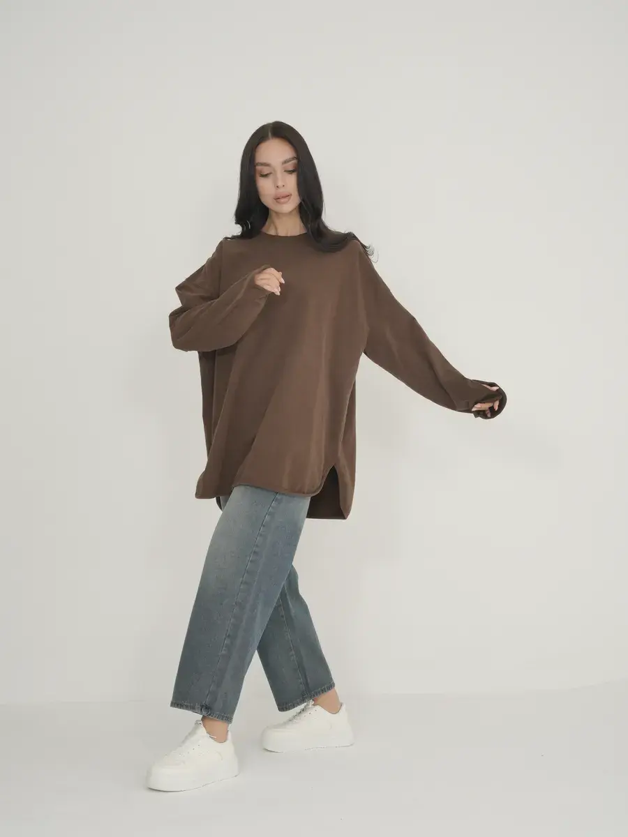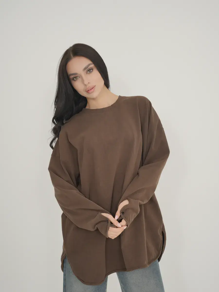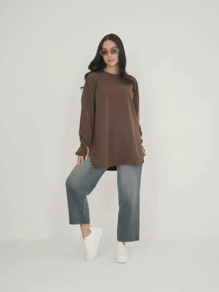 Эластан (5%): Добавляет эластичность и форму, позволяя лонгливу хорошо сидеть на фигуре и не терять форму после стирки.